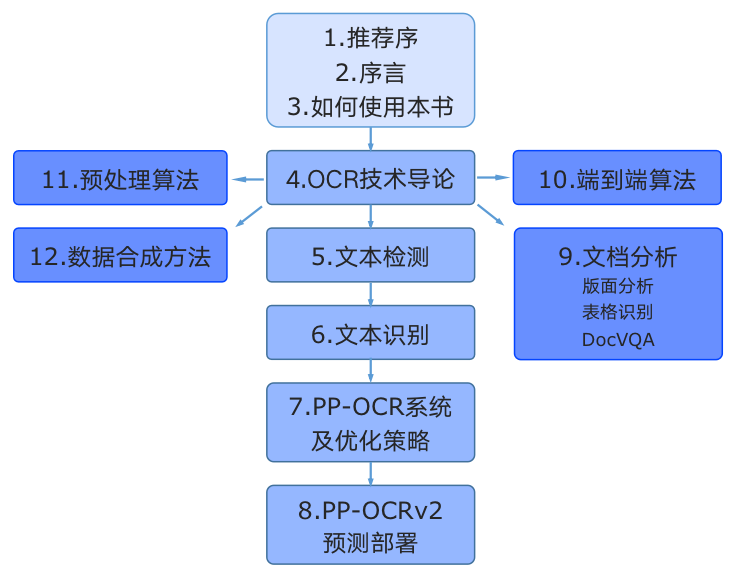 - 第二部分是本书的4-8章,介绍与OCR核心的检测、识别能力相关的概念、应用与产业实践。在“OCR技术导论”中总括性的解释OCR的应用场景和挑战、技术基本概念以及在产业应用中的痛点问题。然后在 “文本检测”与“文本识别”两章中介绍OCR的两个基本任务,并在每章中配套一个算法展开代码详解与实战练习。第6、7章是关于PP-OCR系列模型的详细介绍,PP-OCR是一套面向产业应用的OCR系统,在 基础检测和识别模型的基础之上经过一系列优化策略达到通用领域的产业级SOTA模型,同时打通多种预测部署方案,赋能企业快速落地OCR应用。